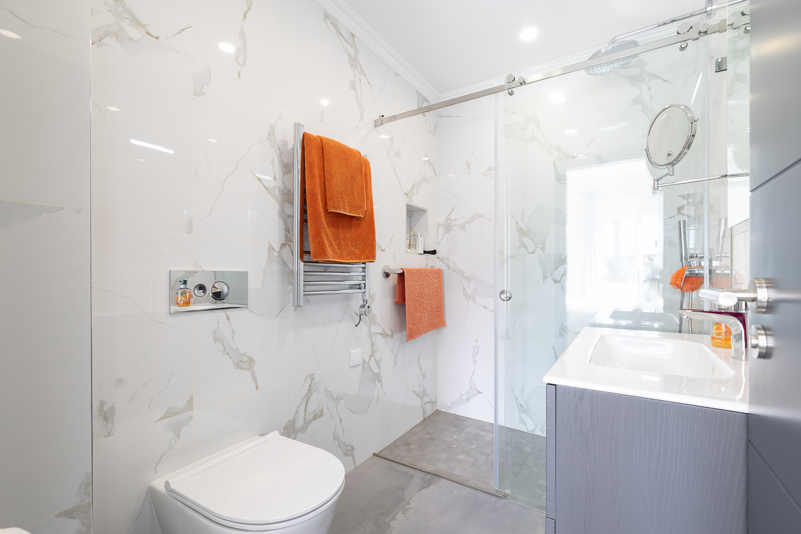 On the first floor, the townhouse offers two spacious ensuite bedrooms, including a master suite with direct access to a south-facing terrace boasting stunning sea views.