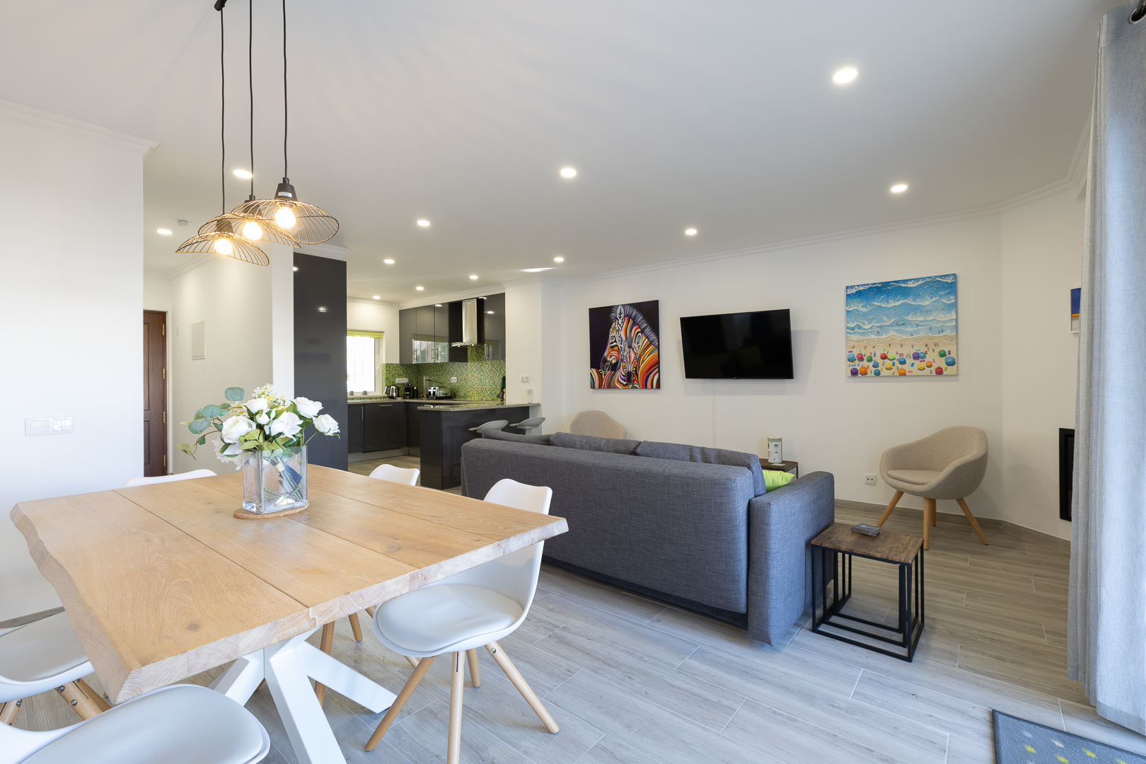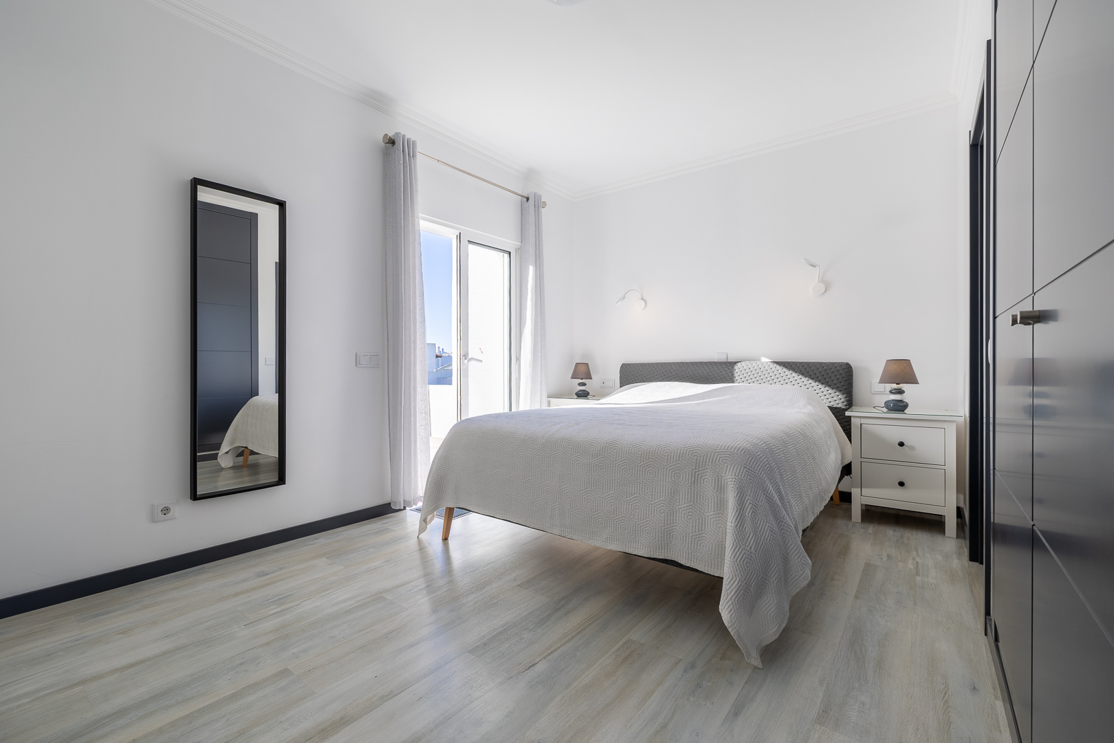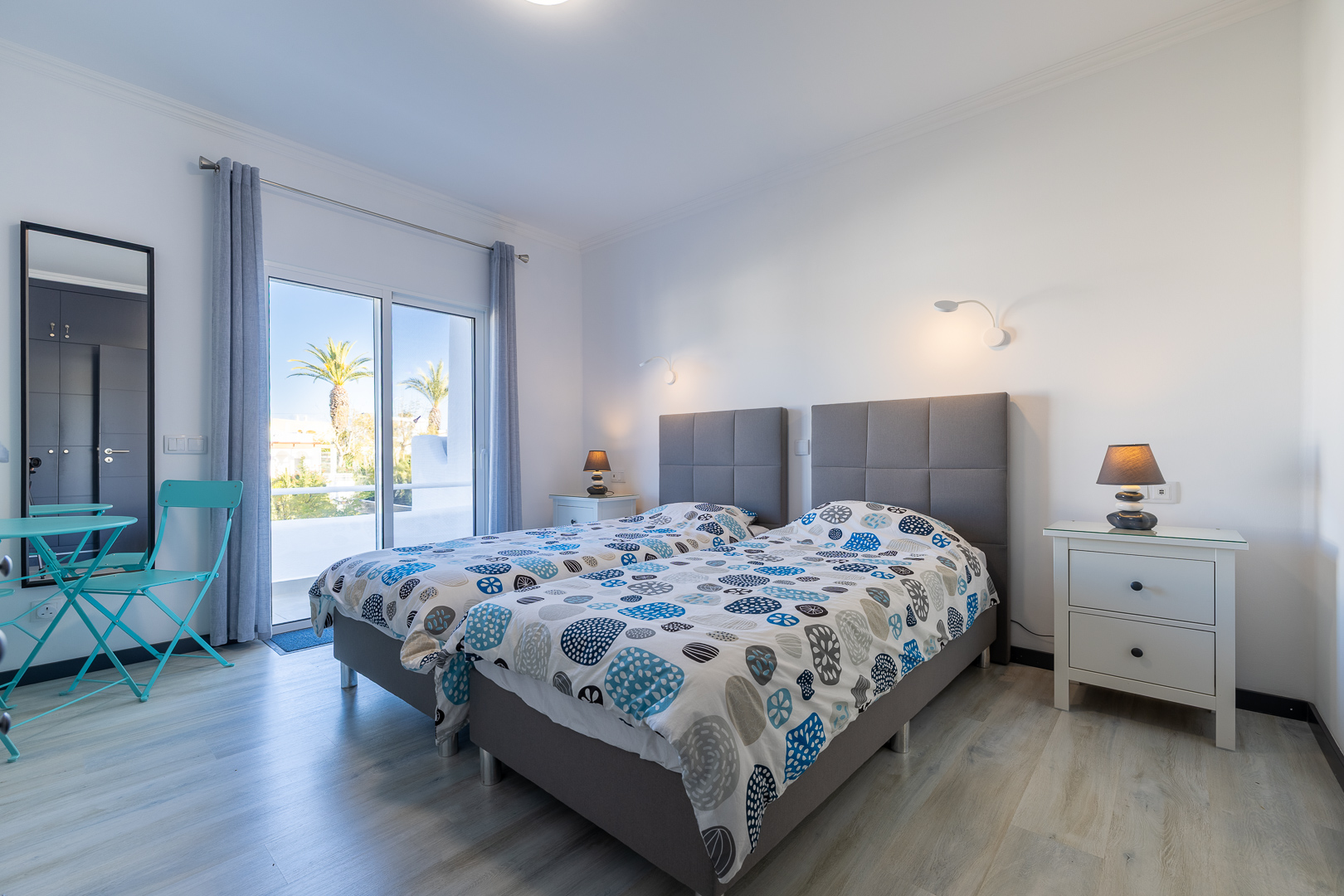 The ground floor features an inviting entrance hall with guest WC, a fully equipped modern kitchen, and a bright open-plan living and dining area. Large sliding doors open onto a west-facing terrace ideal for outdoor dining and enjoying the Algarve’s afternoon sun.