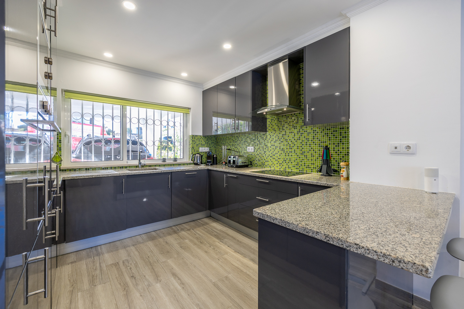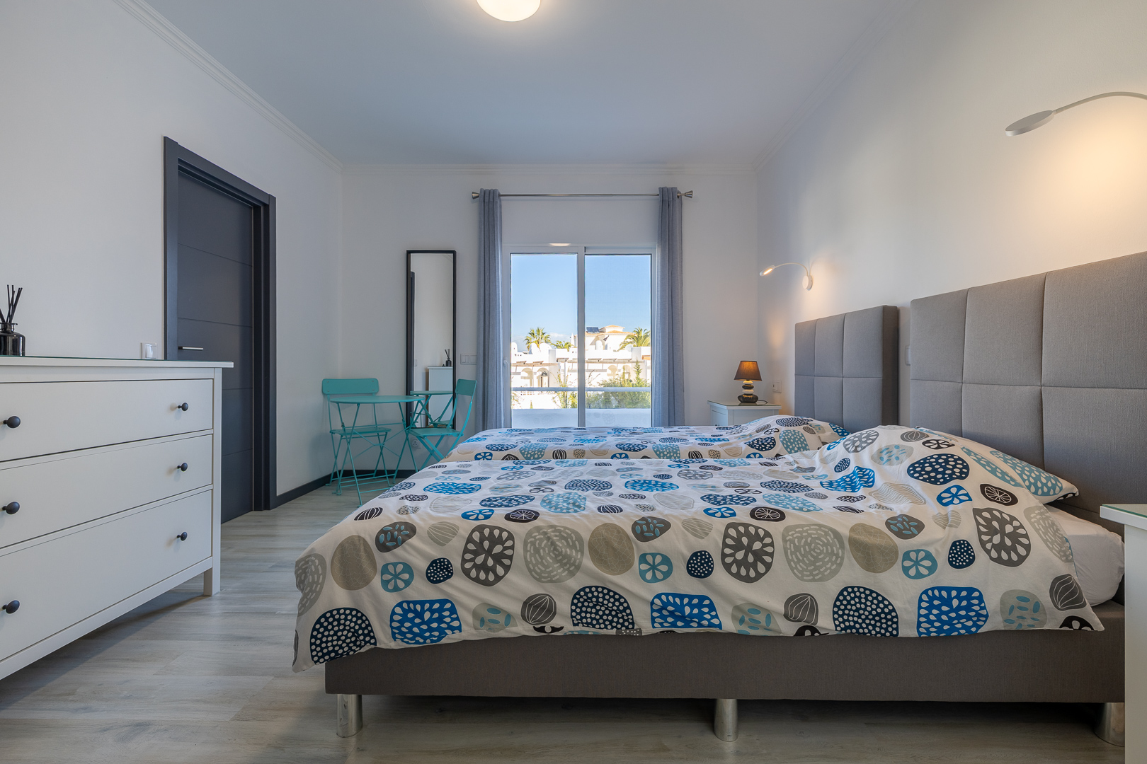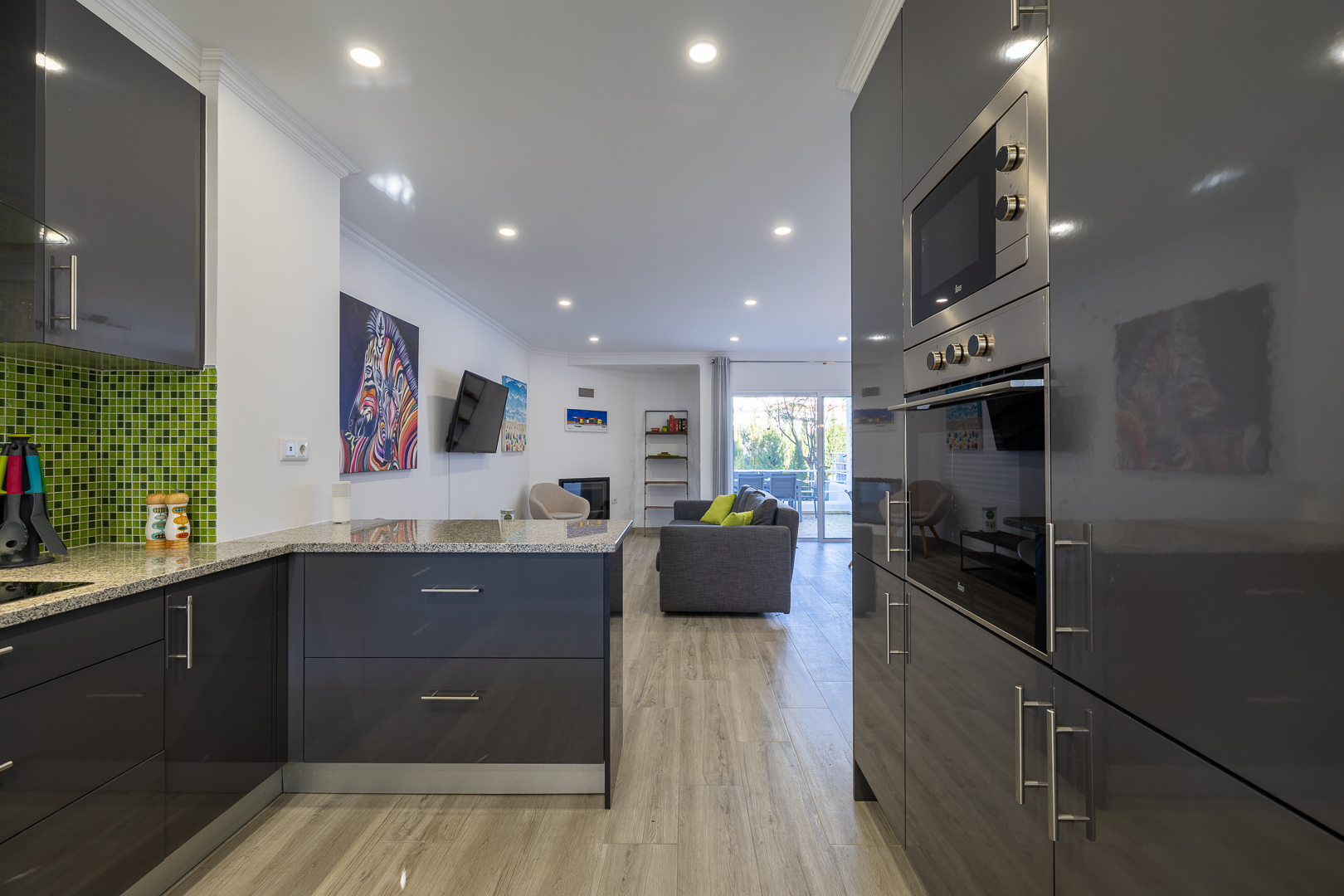 The ground floor features an inviting entrance hall with guest WC, a fully equipped modern kitchen, and a bright open-plan living and dining area. Large sliding doors open onto a west-facing terrace ideal for outdoor dining and enjoying the Algarve’s afternoon sun.